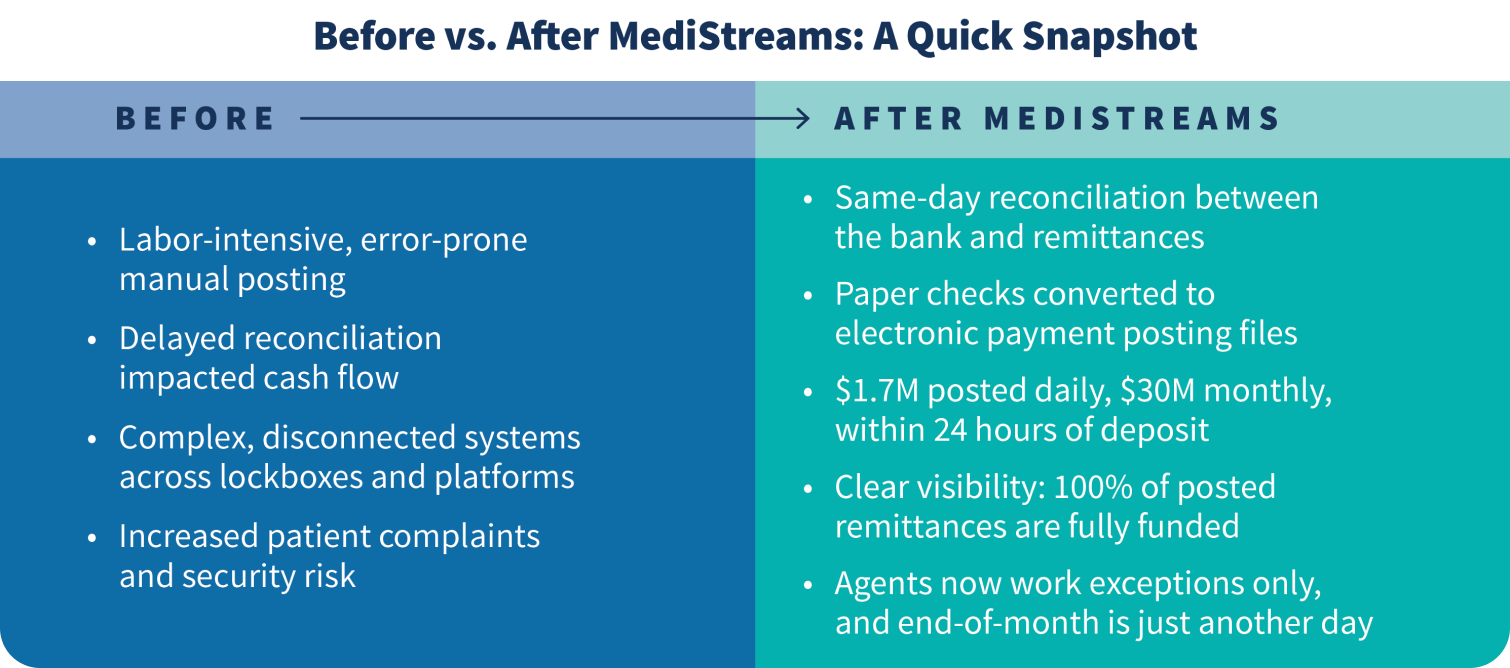 Before MediStreams, the organization received multiple files a day across multiple lockboxes, often incomplete or delayed. Sometimes the day’s files wouldn’t arrive until one or two days later, forcing staff to chase down what was missing. That unpredictability made balancing the books unnecessarily stressful.