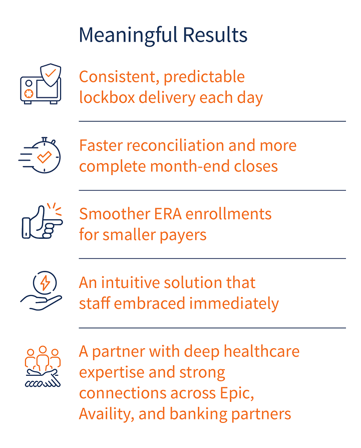 However, as the organization grew, manual bottlenecks began to create friction behind the scenes. Posting delays, inconsistent lockbox delivery, and too much paper-based payer correspondence slowed cash flow and drained staff productivity. What the team needed was more than technology. They needed a partner who could modernize processes and deliver with consistency.