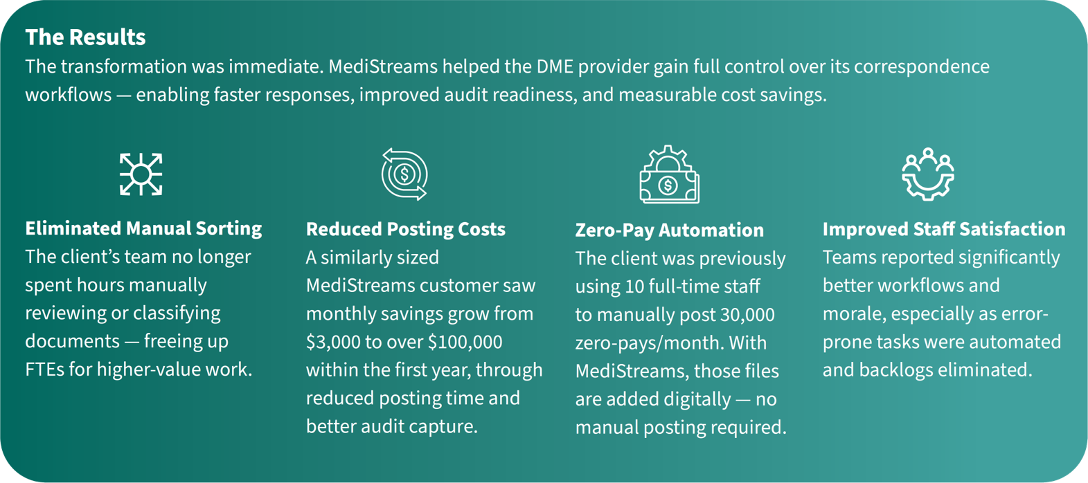 For DME providers handling high volumes of payer correspondence, automation isn’t a nice-to-have; it’s a competitive advantage. MediStreams delivered an end-to-end solution that not only reduced manual effort and lockbox errors but also unlocked revenue that was buried in documents no one had time to sort.